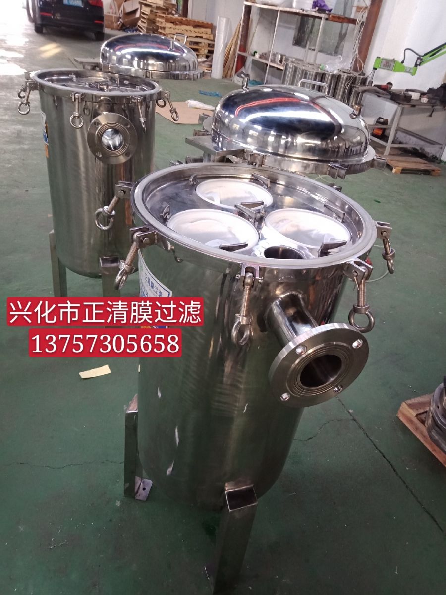 袋式過濾機(jī)是一種壓力式過濾裝置,主要有過濾筒體、過濾筒蓋和快開機(jī)構(gòu)、不銹鋼濾袋加強(qiáng)網(wǎng)等主要部件組成,濾液由過濾機(jī)外殼的旁側(cè)入口管流入濾袋,濾袋本身是裝置在加強(qiáng)網(wǎng)籃內(nèi),液體滲透過所需要細(xì)度等級(jí)的濾袋即能獲得合格的濾液,雜質(zhì)顆粒被濾袋攔截。該機(jī)更換濾袋十分方便,過濾基本無物料消耗。
