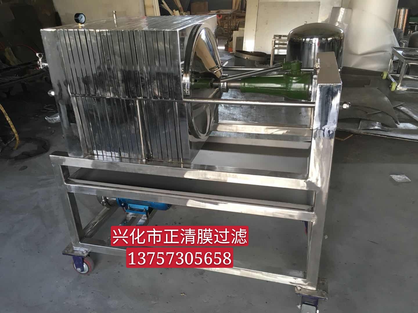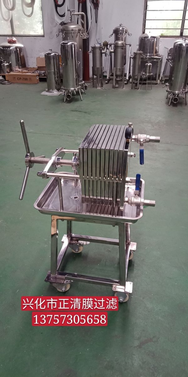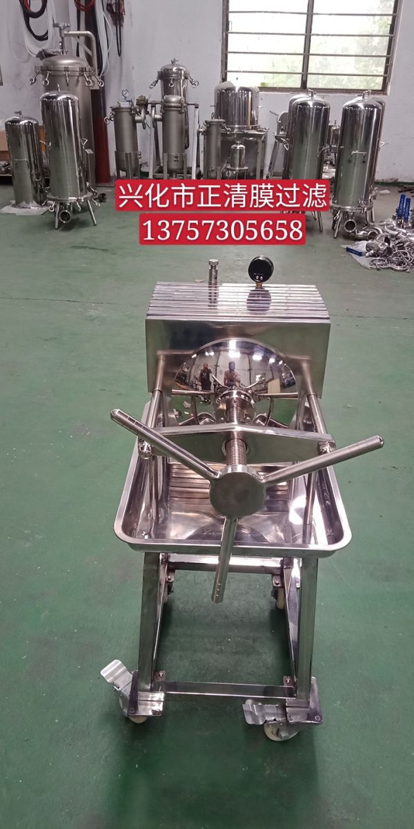 本機為不銹鋼多層板框壓濾機,適用于濃度50%以下粘度較低,含渣量較少的液體作密閉過濾以達到提純,滅菌、澄清等精濾、脫活性碳、除微粒、半精濾的要求,直接選用微孔濾膜,可不經微孔薄膜過濾器過濾可達到無菌過濾之目的)。本機過濾面積大,流量大,適用范圍大,所以在制藥、化工、食品等行業(yè)有廣泛用途,應用在制藥廠針劑藥液之過濾,效果甚佳。