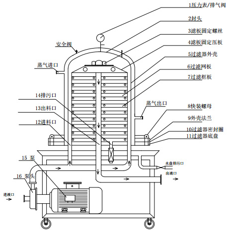 ZQNCD型過濾機由筒體、過濾液板、視鏡、雙向壓緊裝置、循環(huán)管路系統(tǒng)。開啟進(jìn)料閥,過濾開始,濾液即被輸送到指定的貯罐內(nèi)。